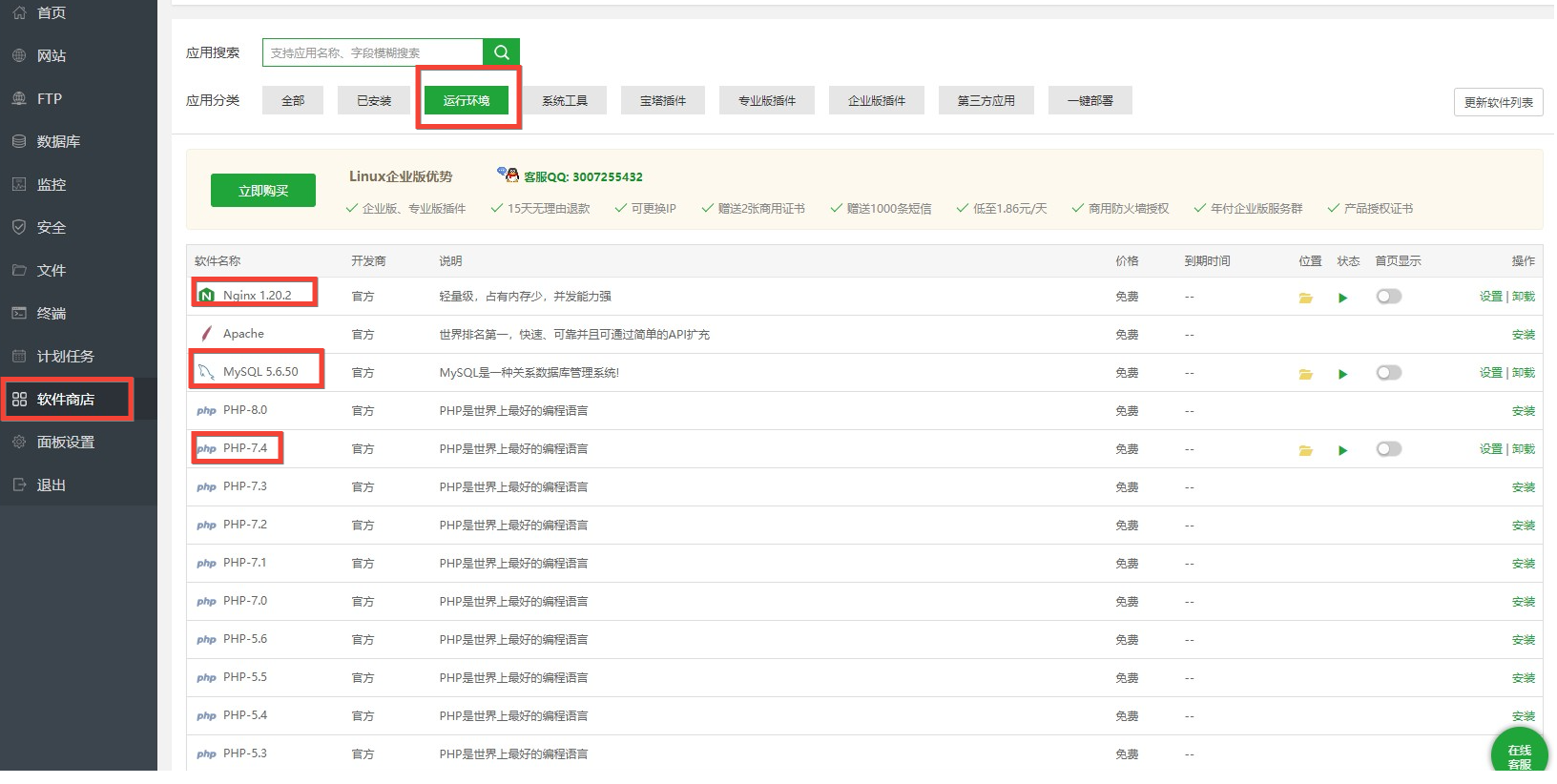 在软件管理选择你所需要的网站环境进行安装。