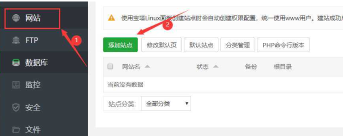 点击宝塔面板左侧的网站,然后点击添加网站