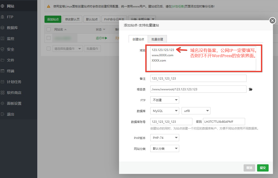 域名里面可以自定义域名,请先将域名解析到服务器的ip上,然后在添加域名,数据库选择MySQL,默认会自动创建一个数据库名称和密码,PHP默认,这里一定要注意了,如果域名没有备案,一定要填写ip地址。设置这里大概是这样。