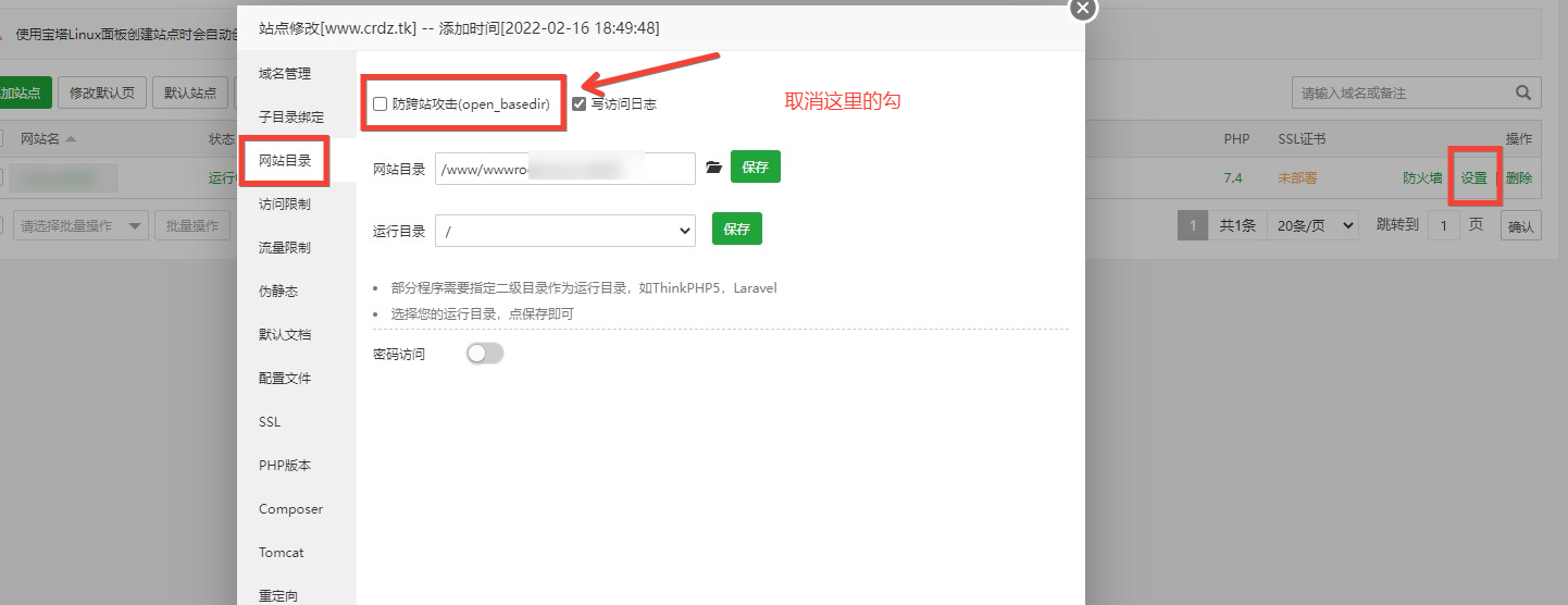 取消防跨站攻击(open_basedir)前面的√