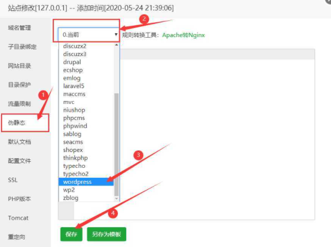 点击伪静态,点击下拉列表选择WordPress,然后点击保存