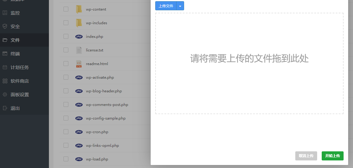 点击上传按钮,点击选择文件,选择下载的WordPress程序,然后点击开始上传