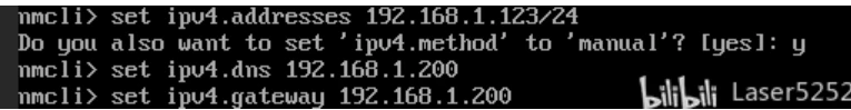 输入:set ipv4.gateway 192.168.1.200 设置网关,网关地址也是指向旁路由的ip地址