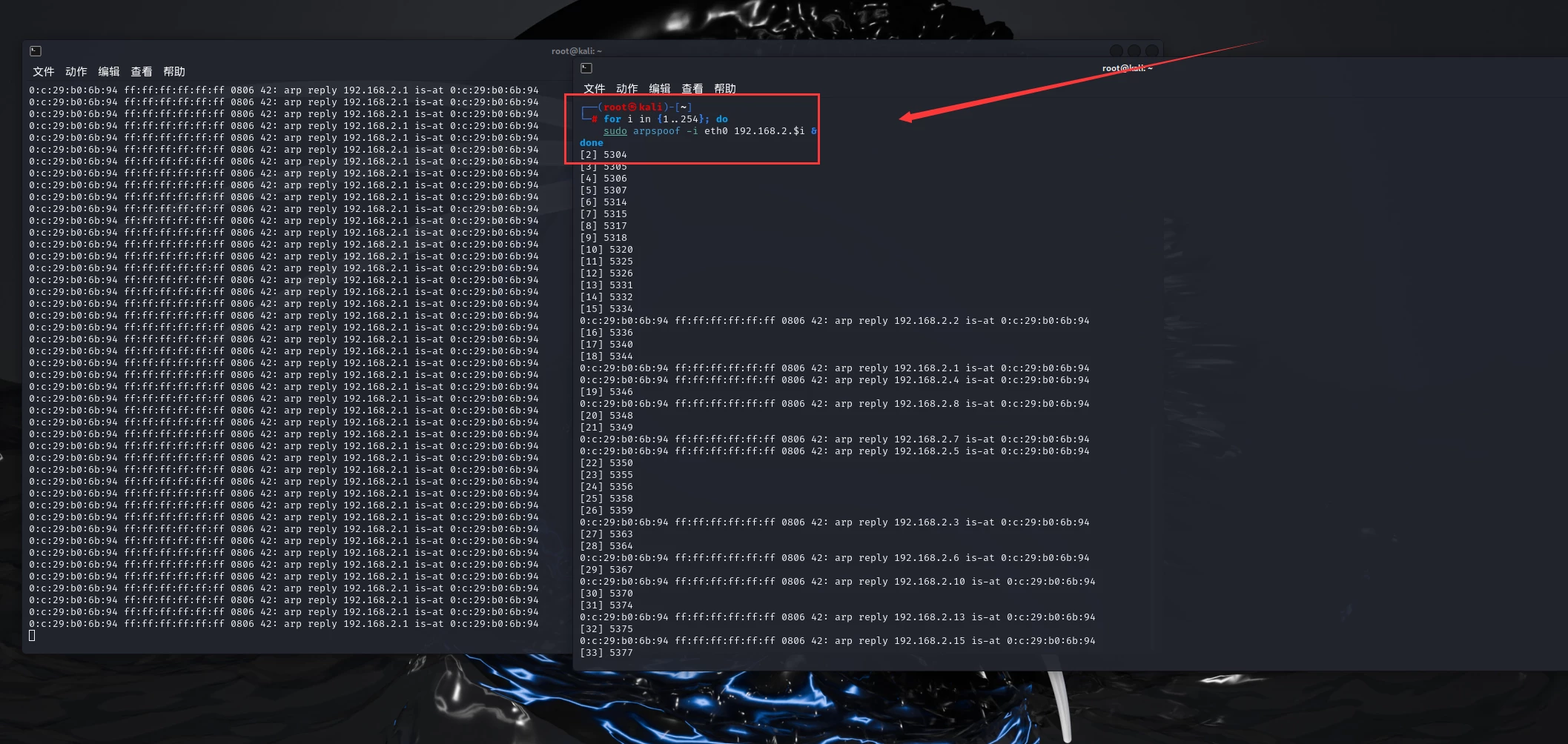 新打开一个终端窗口,在终端中使用循环来对所有IP地址执行ARP欺骗: