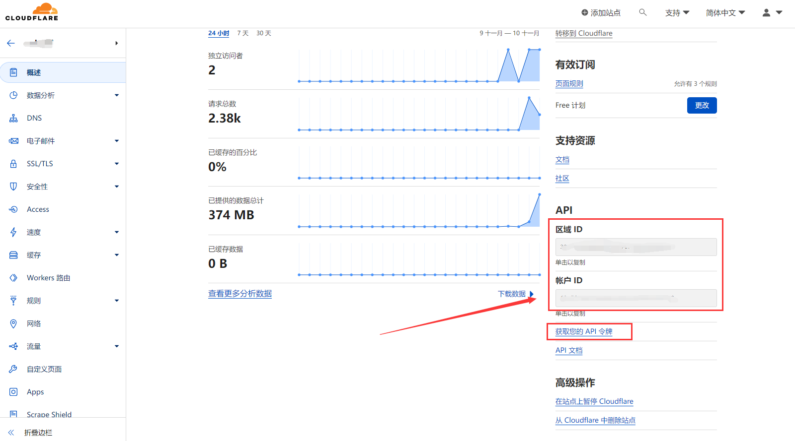 在做自动更新的时候我们需要cloudfare的令牌和域名的id(区域id)