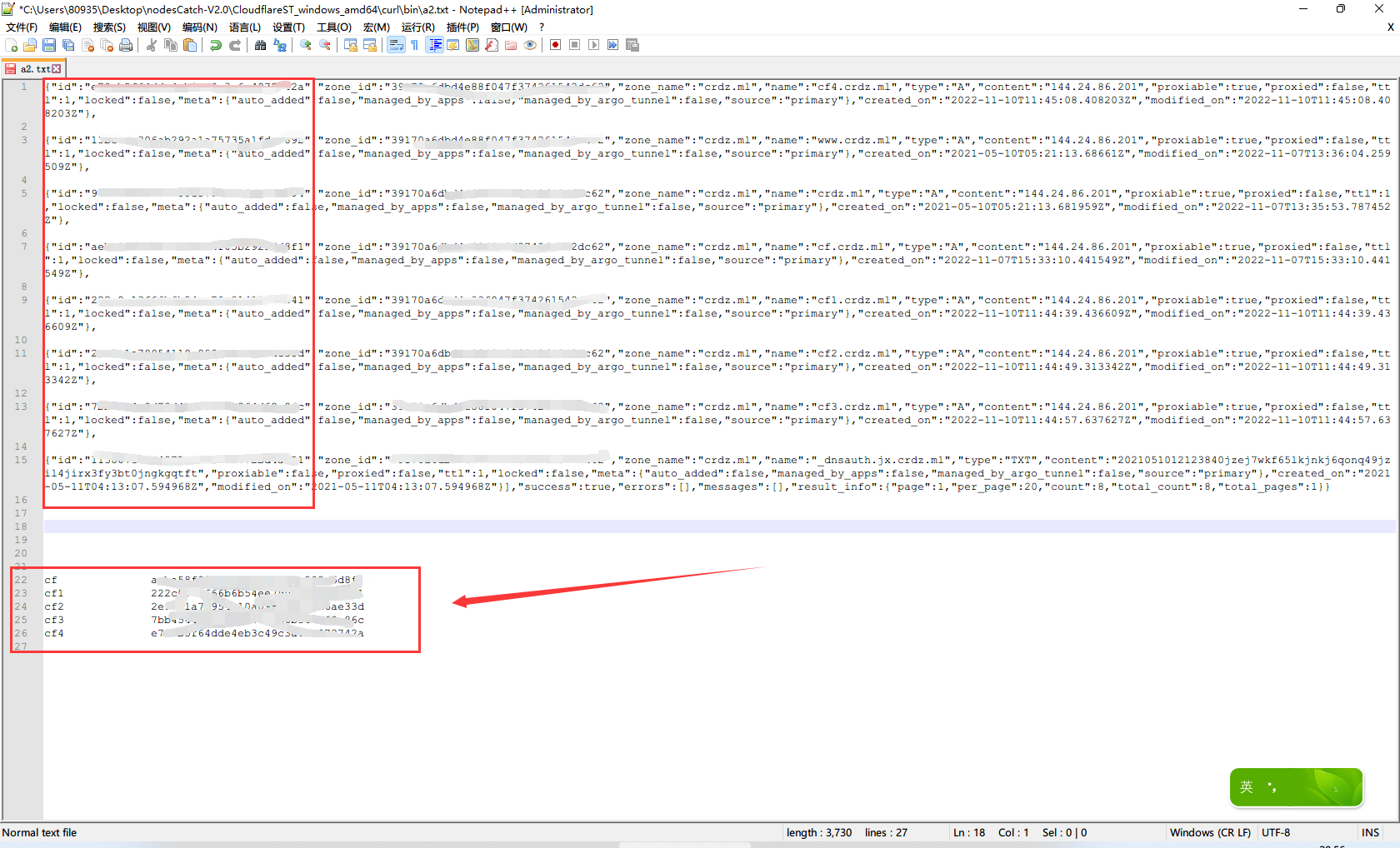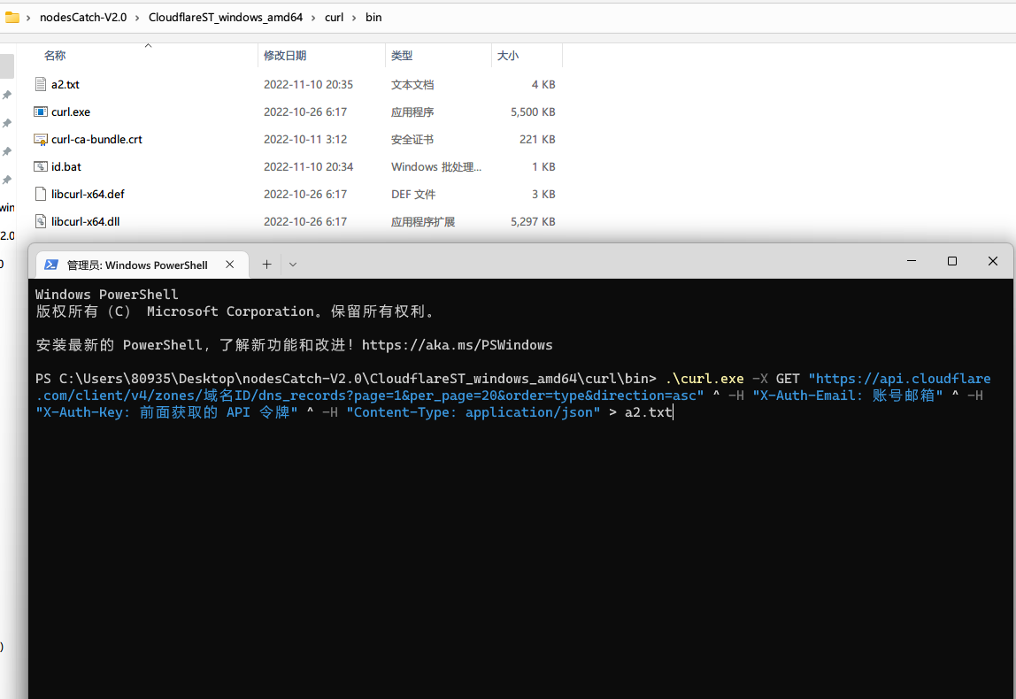 .\curl.exe -X GET "https://api.cloudflare.com/client/v4/zones/区域ID/dns_records?page=1&per_page=20&order=type&direction=asc" ^ -H "X-Auth-Email: 账号邮箱" ^ -H "X-Auth-Key: 前面获取的 API 令牌" ^ -H "Content-Type: application/json" > a2.txt