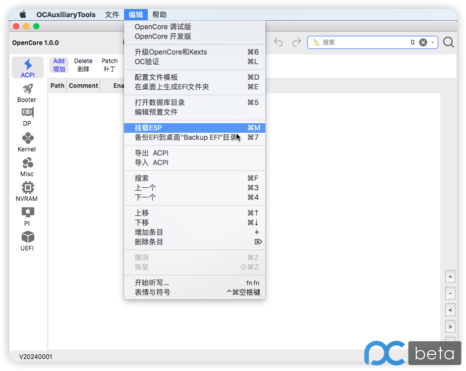 应用菜单:编辑 > 挂载ESP(快捷键:Command + M,对应Windows键盘上的Windows +M)