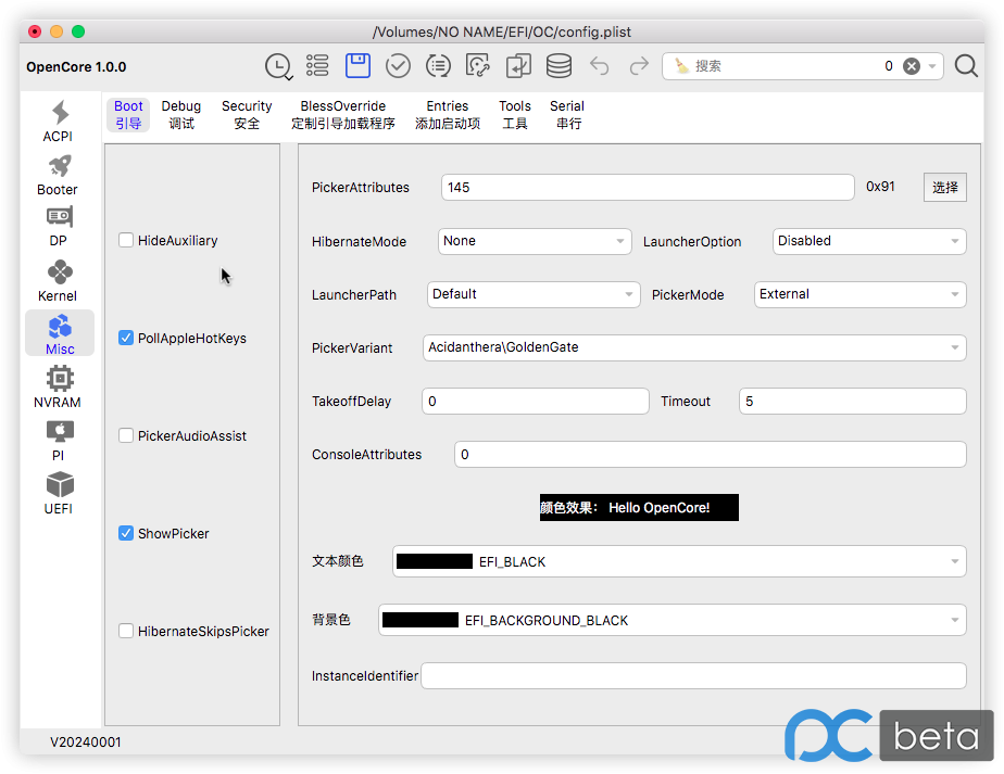 选中 macOS 系统安装磁盘,点击 挂载并打开Config.plist配置文件