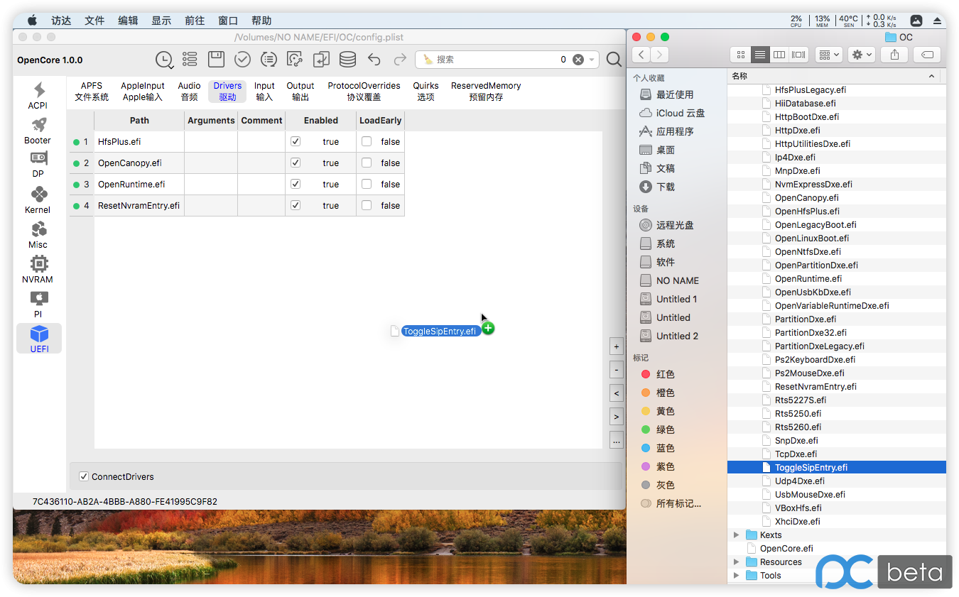 进入:EFI/OC/Drivers 目录,将 ToggleSipEntry.efi 拖曳至 Drivers驱动 窗口中完成添加