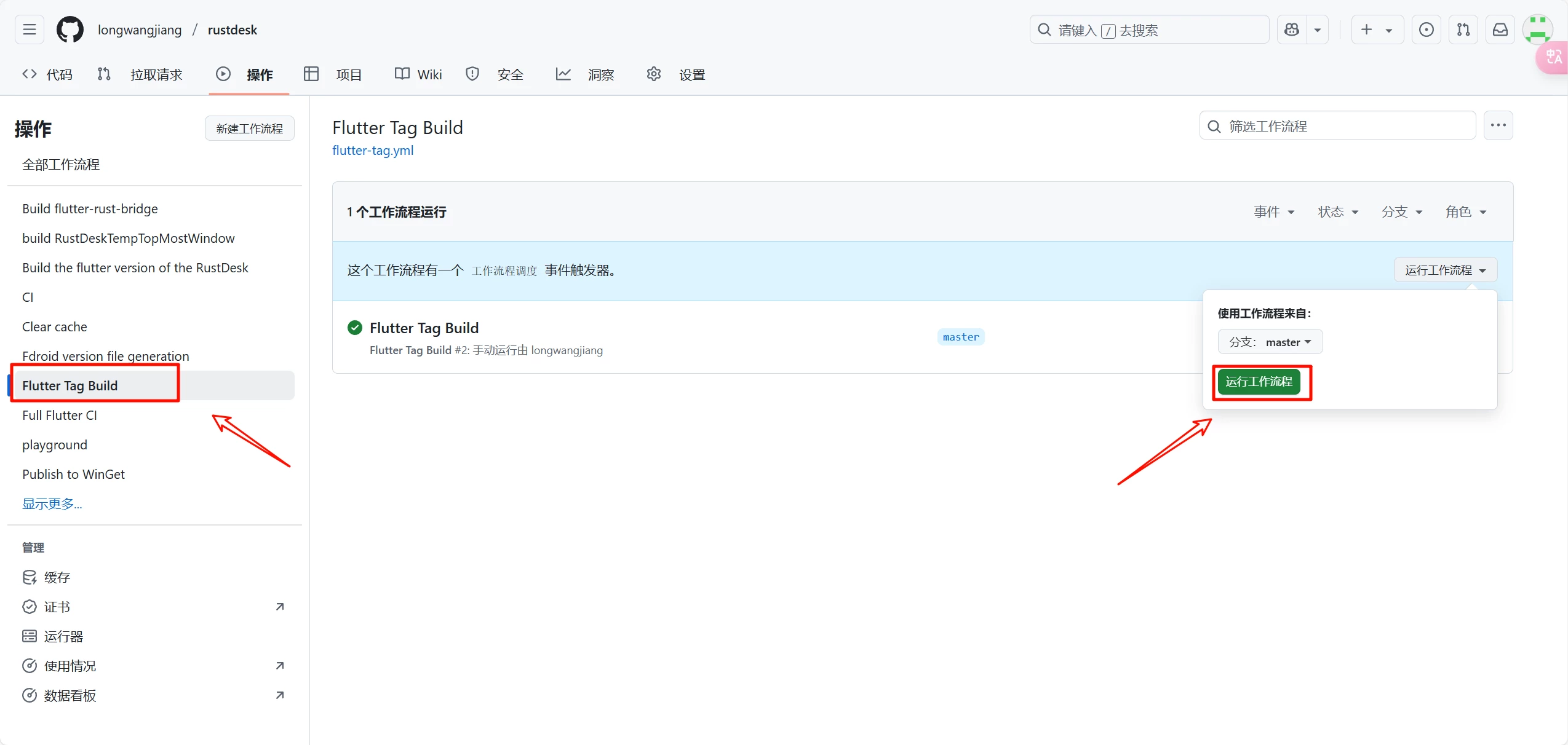 🔻 点击 Flutter Tag Build ,选择Run workflow,找到Tags下最新的版本。(也可以选择nightly)