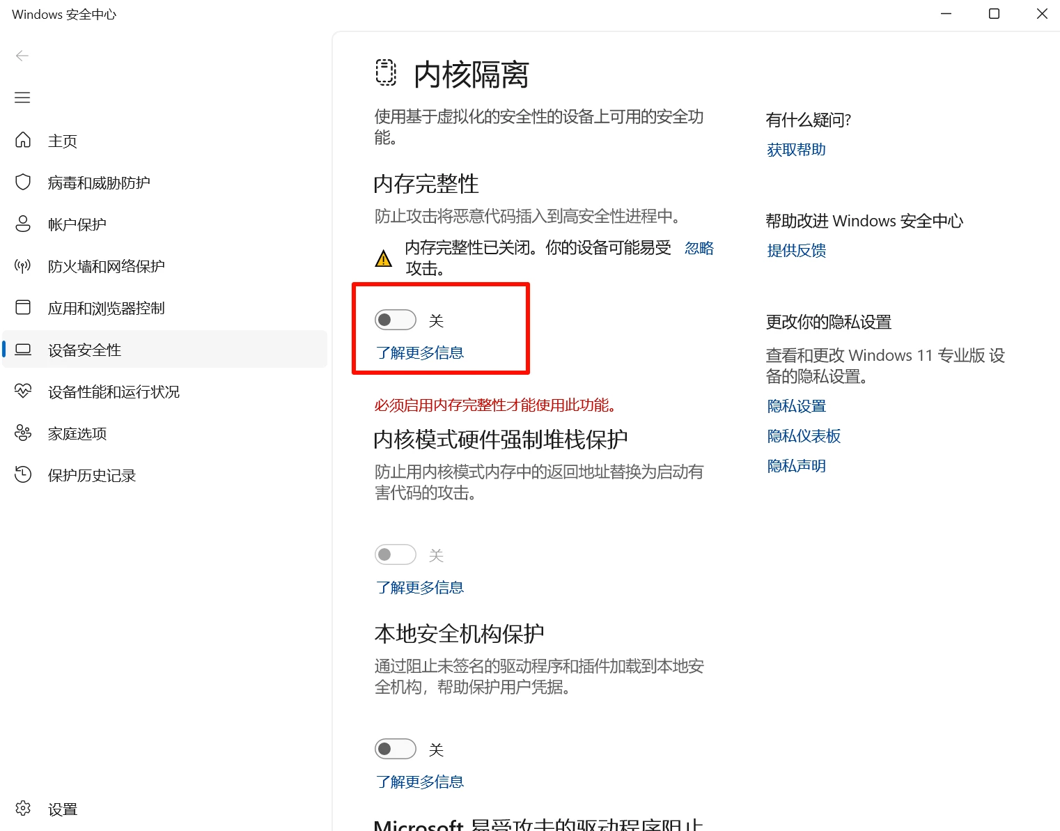 进入 组策略方法=>计算机配置=>管理模板=>系统=>设备防护=>启用基于虚拟化的安全性=>禁用=>重启电脑