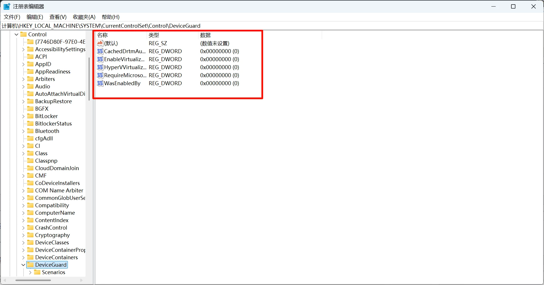 win键+R命令输入regedit进入注册表,转到HKEY_LOCAL_MACHINE\System\CurrentControlSet\Control\ DeviceGuard,把里面的键值全部改为0,1表示启用基于虚拟化的安全性,将其设置为0表示禁用它。