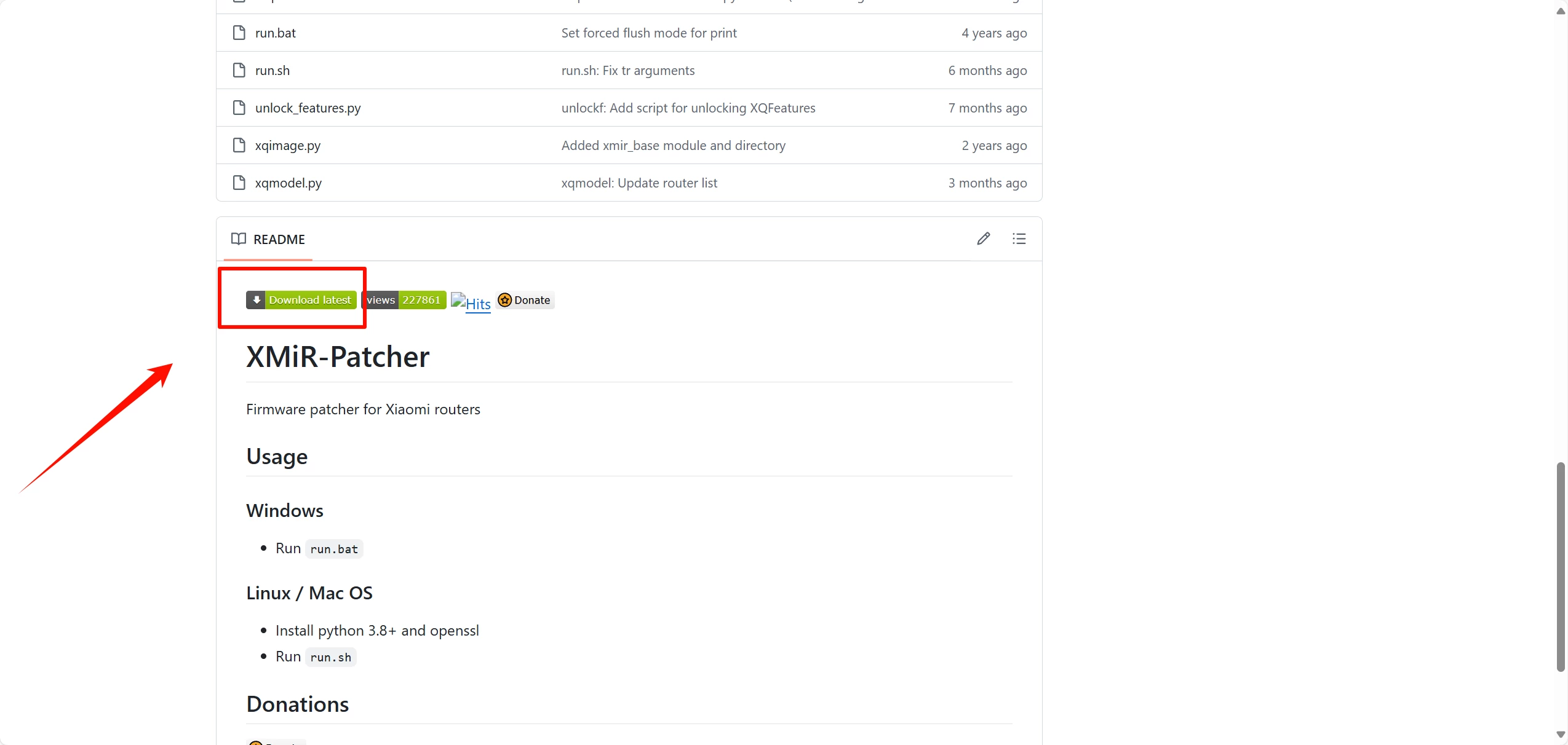 在小米网段的电脑上访问Github的地址:https://github.com/openwrt-xiaomi/xmir-patcher