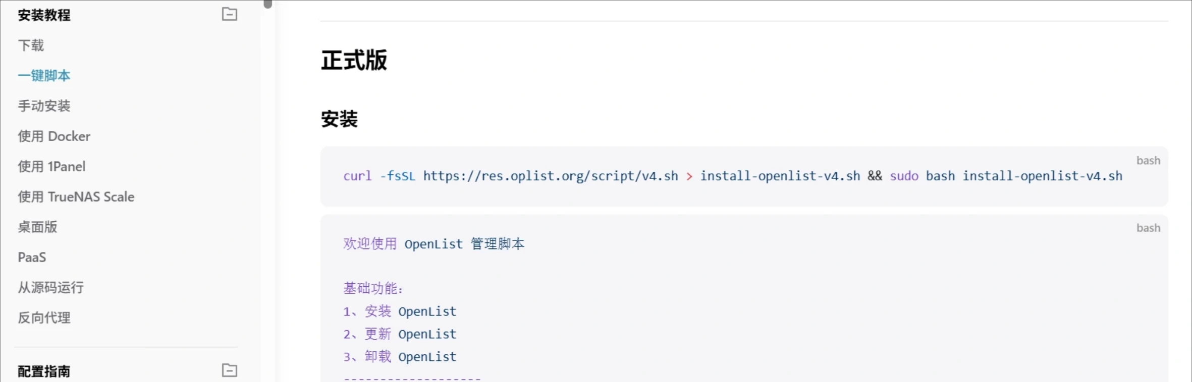 OpenList 官方文档提供了多种安装方式和配置指南,可以根据自己的情况参考官方文档完成安装配置,官方文档如下:https://doc.oplist.org/guide/installation/script