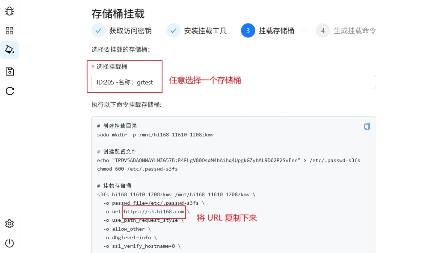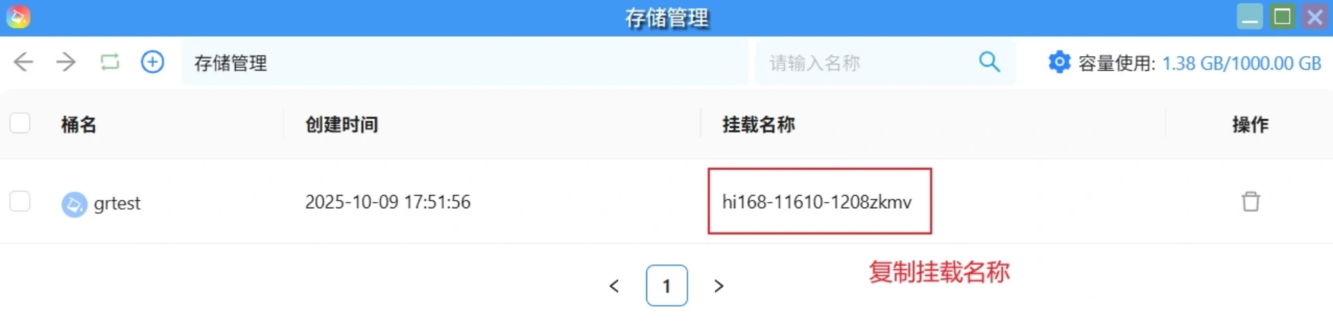 在 Hi168 桌面点击已经部署的任意应用(如果没有部署的应用可以在应用中心随便部署一个,用完以后立即删除即可),打开部署的应用,左侧就可以看到挂在到存储桶选项了,点击到“挂载存储桶”,即可看到“访问密钥 ID”和“访问密钥”,将其复制备用。