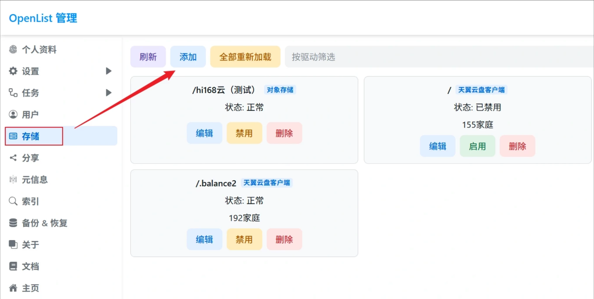 登录 OpenList 后台,点击“存储”-->“添加”。