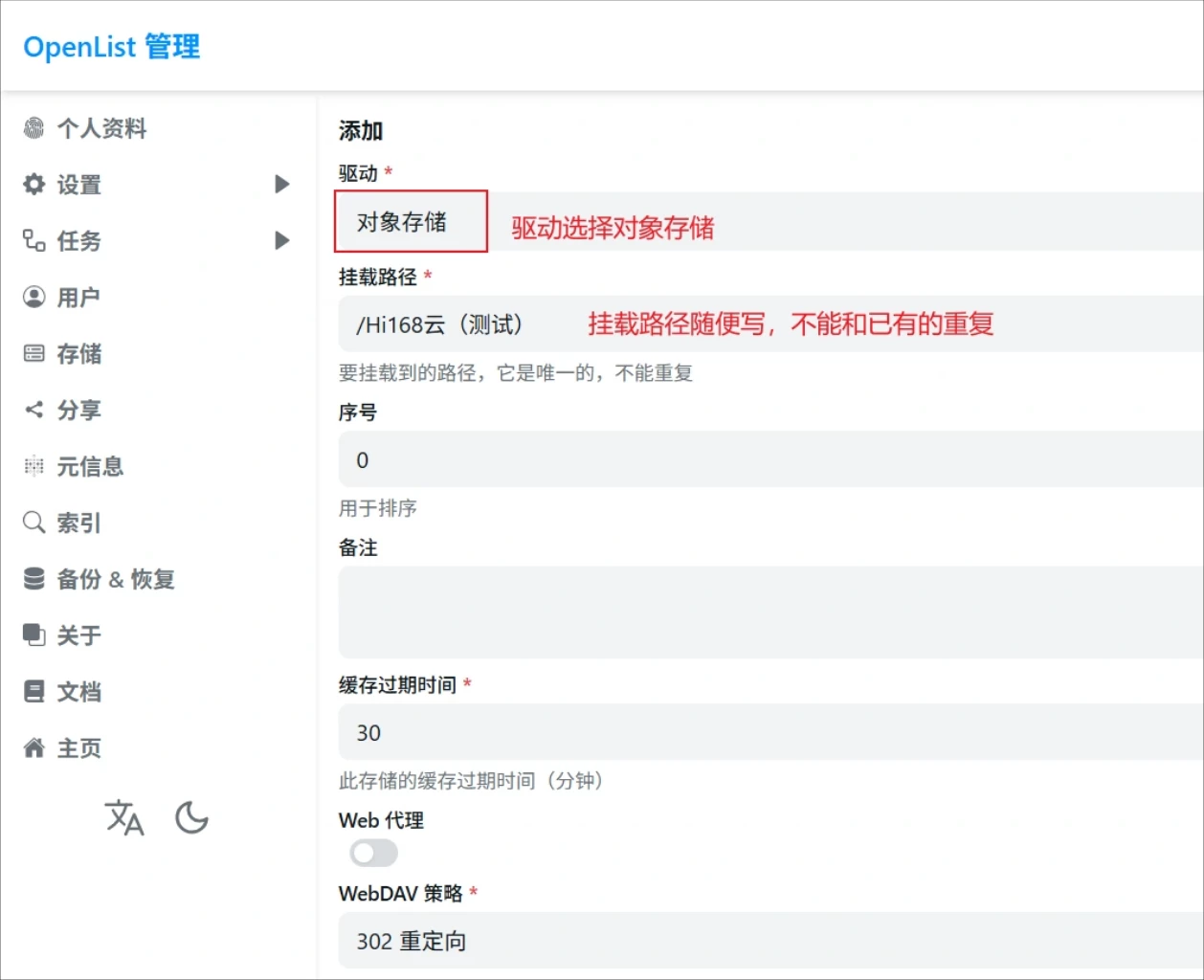 驱动选择“对象存储”,随便填写一个挂载路径,注意不要和已有挂载路径名称重复就行。