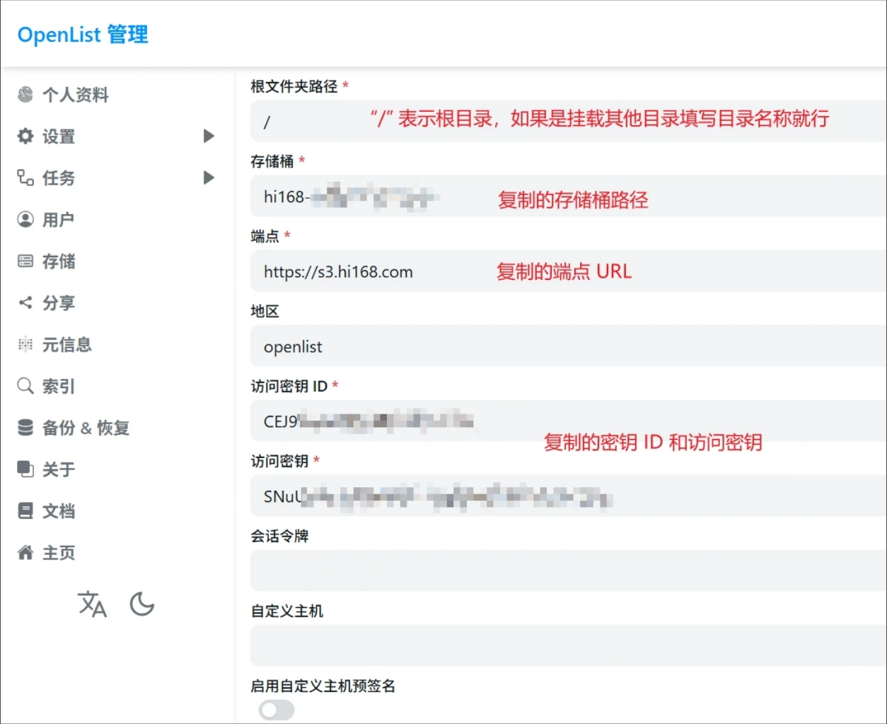 这样就得到了 OpenList 添加存储所需要的“存储桶”、“端点”、“访问密钥 ID”、“访问密钥”四项参数。