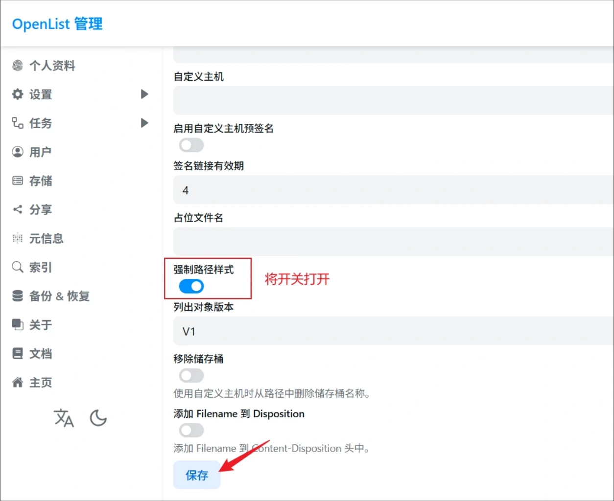 其他保持默认,再往下滑动到“强制路径样式”配置,将开关打开后点击“保存”即可。