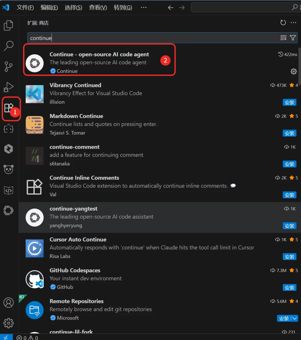搜索 "Continue"(由Continue Dev官方提供)