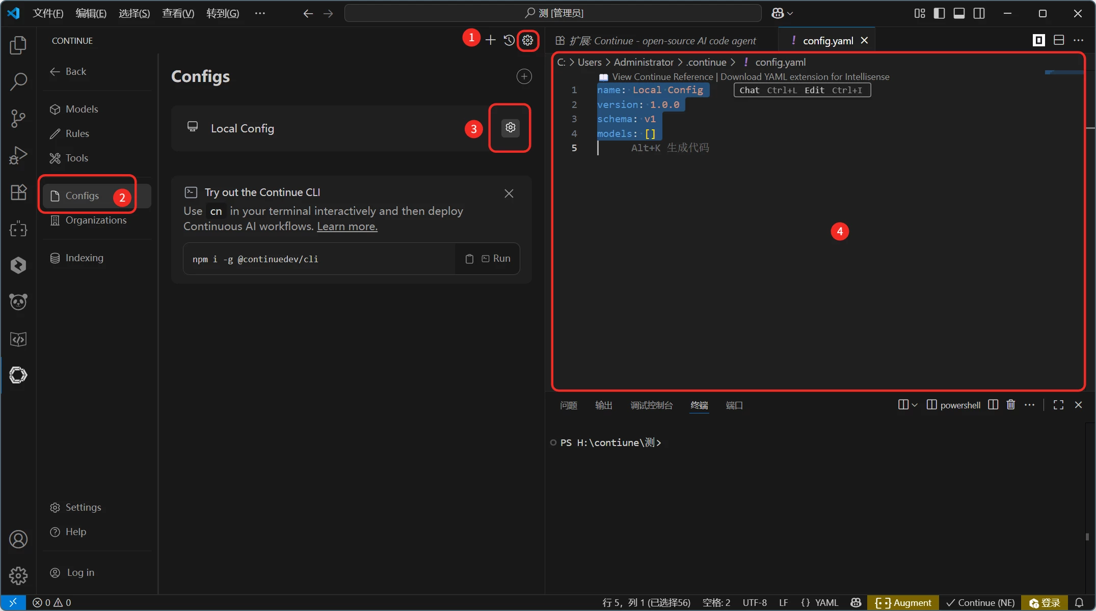 也可通过配置文件 ~/.continue/ config.yaml 进行详细配置