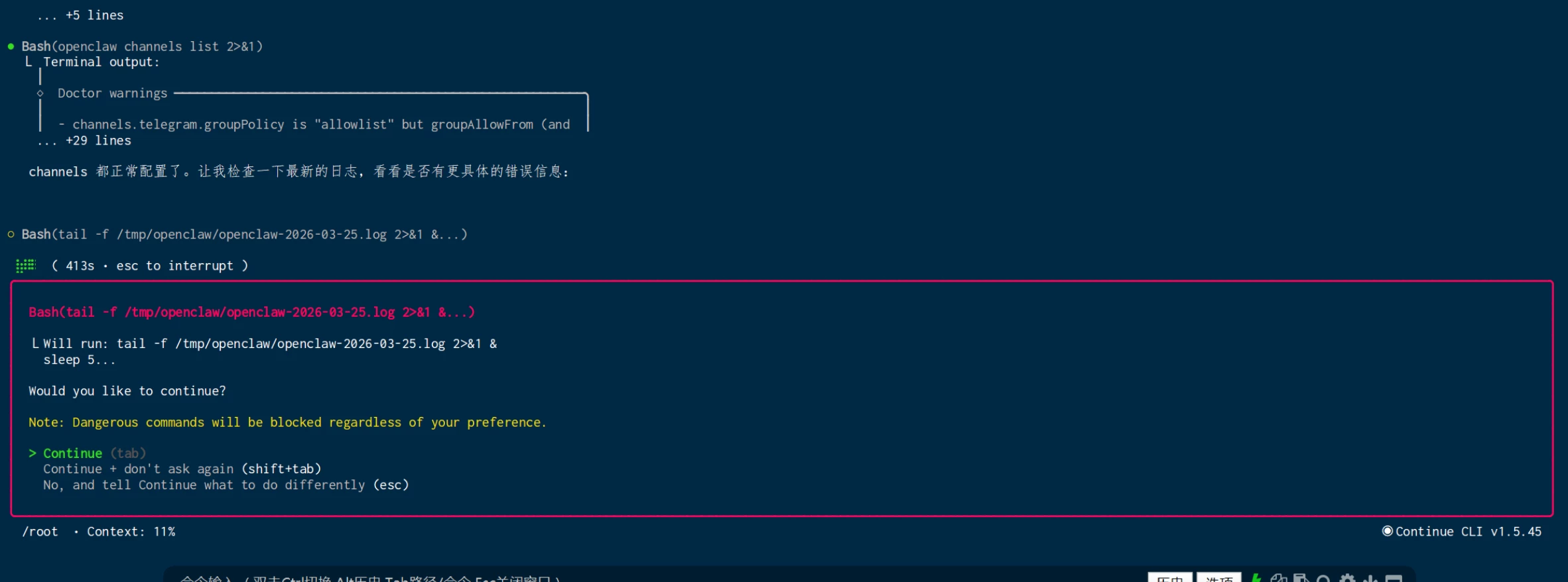 重启 Continue 插件 / 服务,之后所有命令都会自动执行,不再弹窗确认。