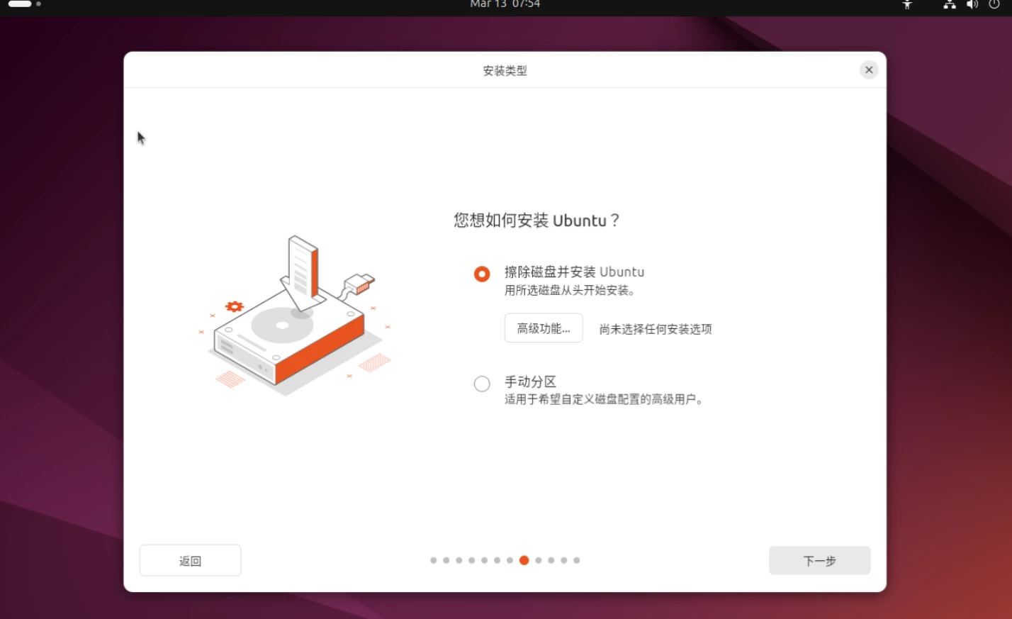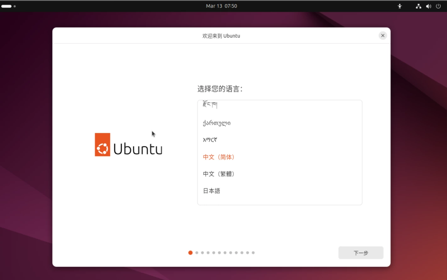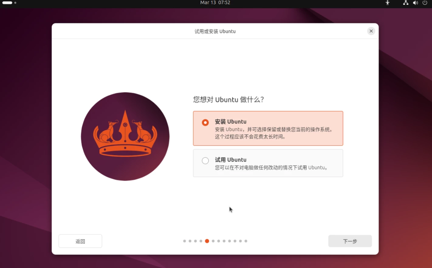 - 试用或安装:选择「安装 Ubuntu」→ 点击「下一步」