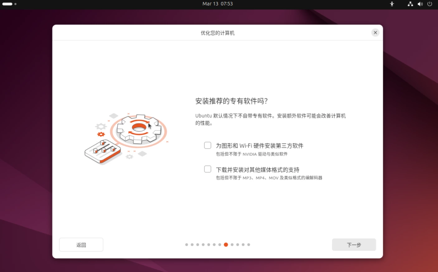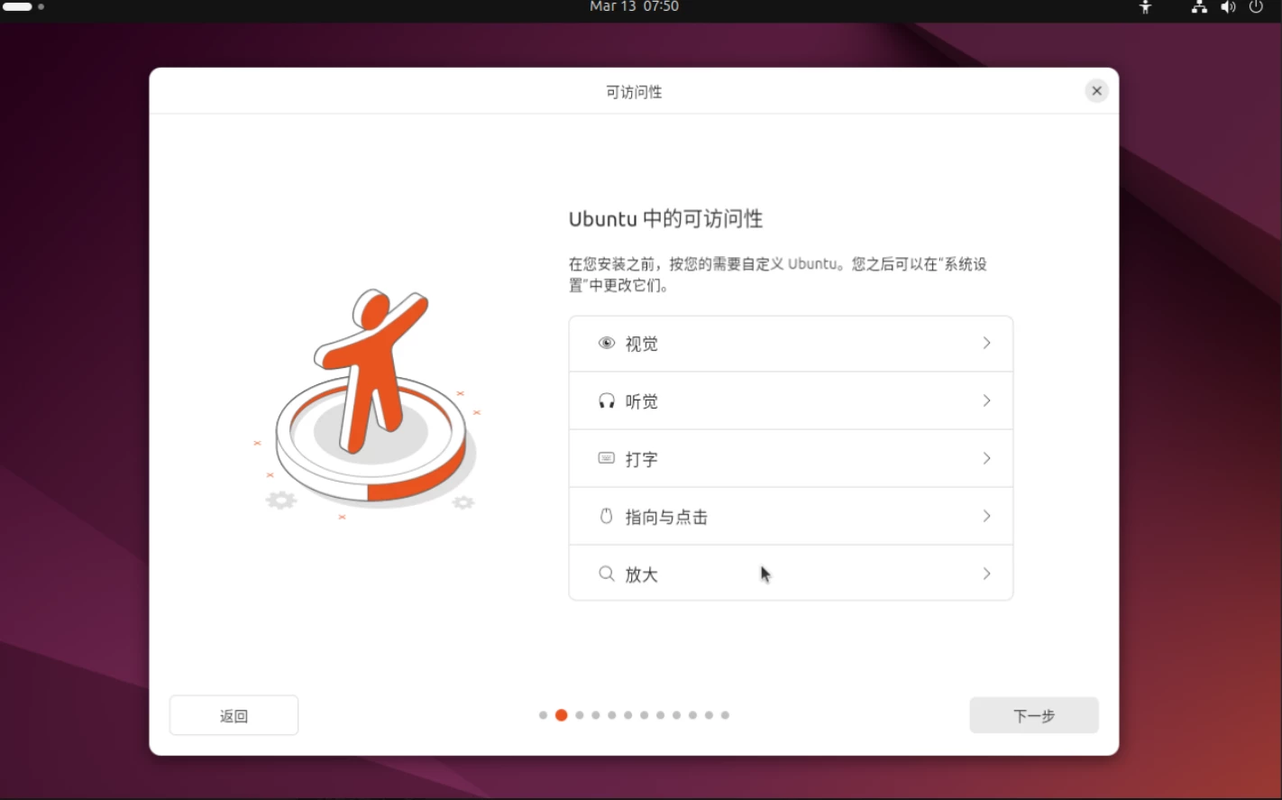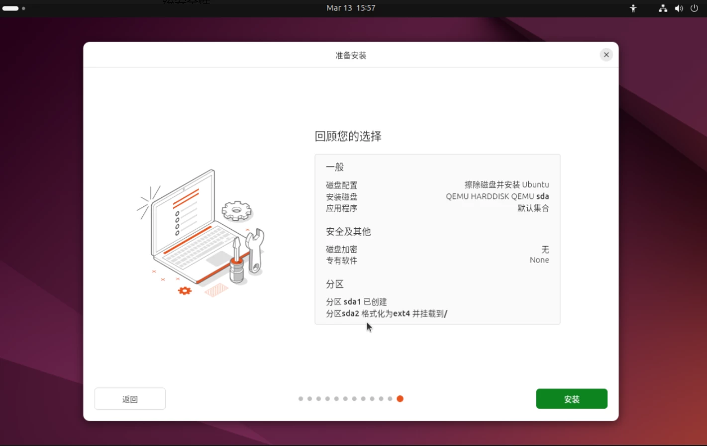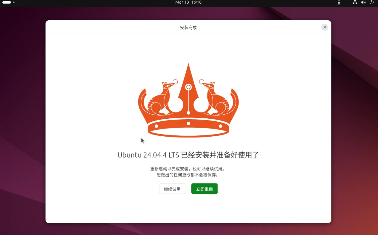 - 试用或安装:选择「安装 Ubuntu」→ 点击「下一步」