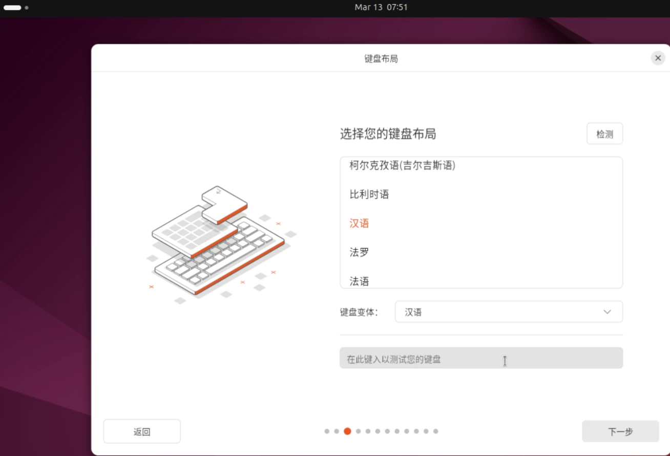 - 键盘布局:选择「汉语」→ 点击「下一步」