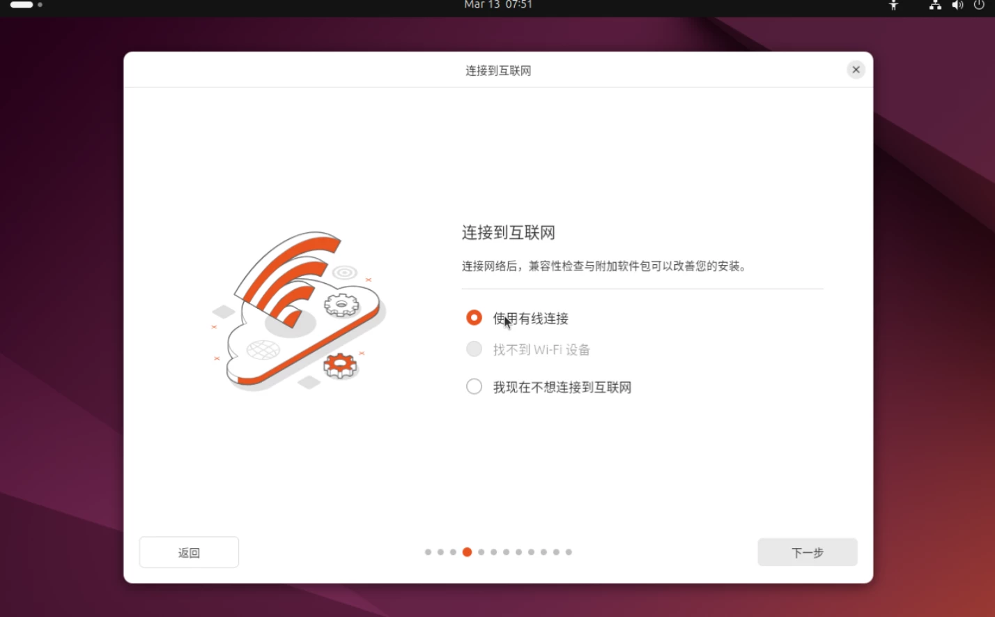 - 连接到互联网:选择「使用有线连接」→ 点击「下一步」