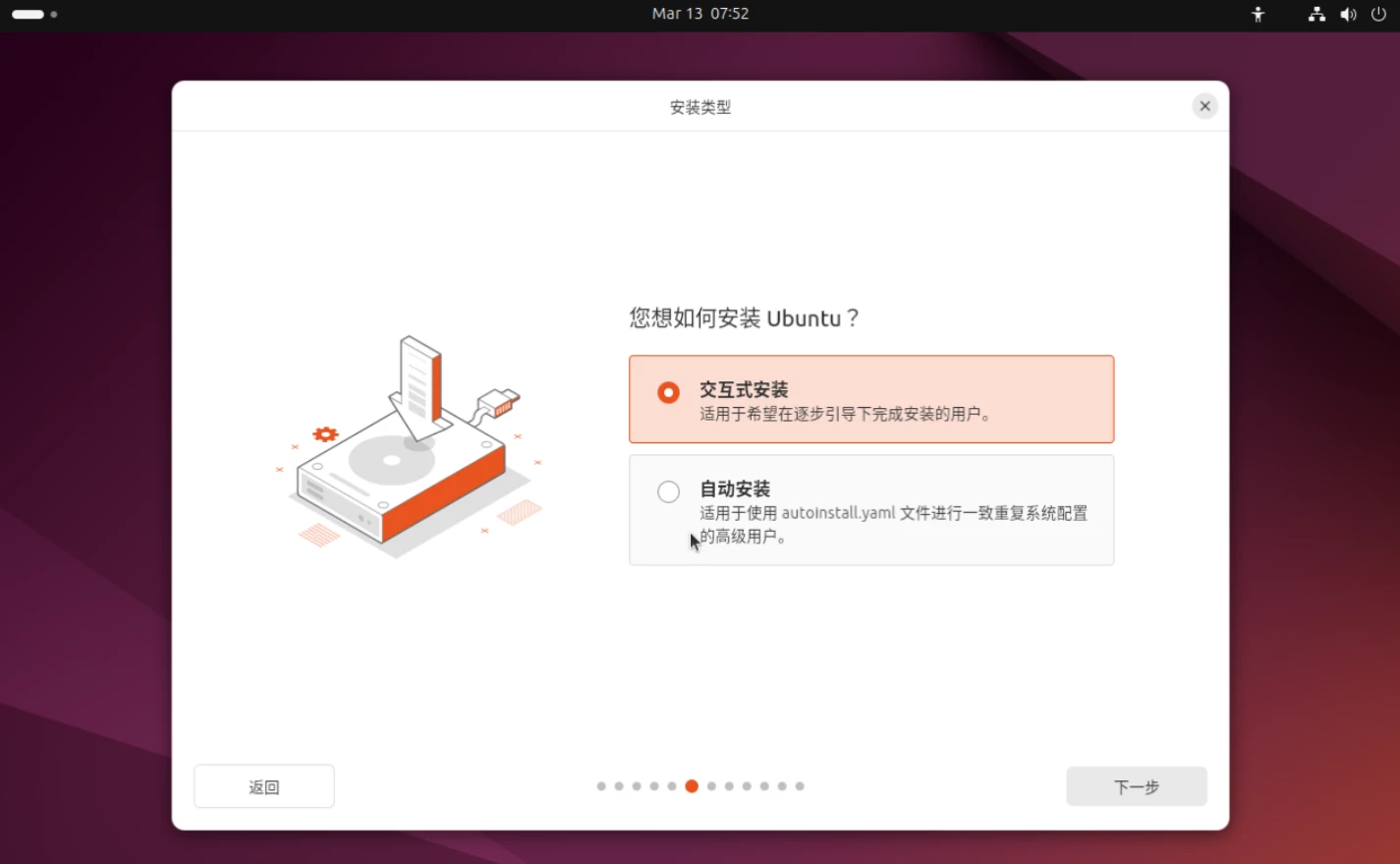 - 安装类型:选择「交互式安装」→ 点击「下一步」