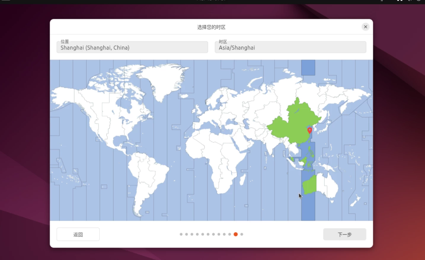 - 时区选择:在地图上点击中国区域,选择「Shanghai (Shanghai, China)」→ 点击「下一步」