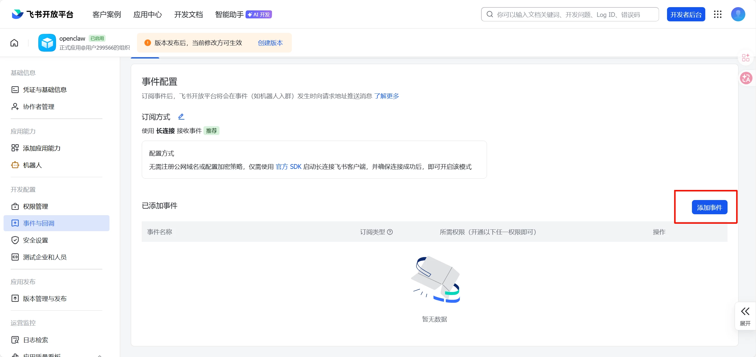 如果提示:未检测到应用连接信息,请确保长连接建立成功后再保存配置,就把/root/.openclaw/openclaw.json里的文件这块位置修改成这样
