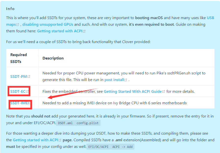 对照列表,我的只有CPU-PM、EC,所以我只需要下载这两个就行了,还有前面的SSDT-IMEI一共三个文件,你们的平台自己参照表格。我的只需要这两个文件。但是也说了CPU-PM需要安装好系统后,再用批处理生成添加,我嫌太麻烦用了别人的CPU-PM,其他两个是下载的。