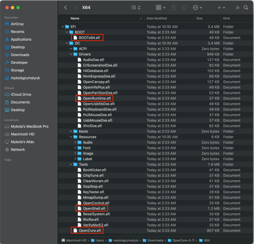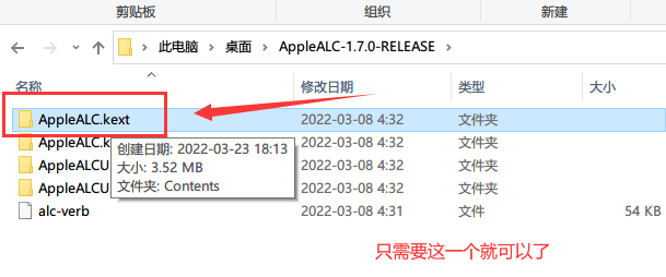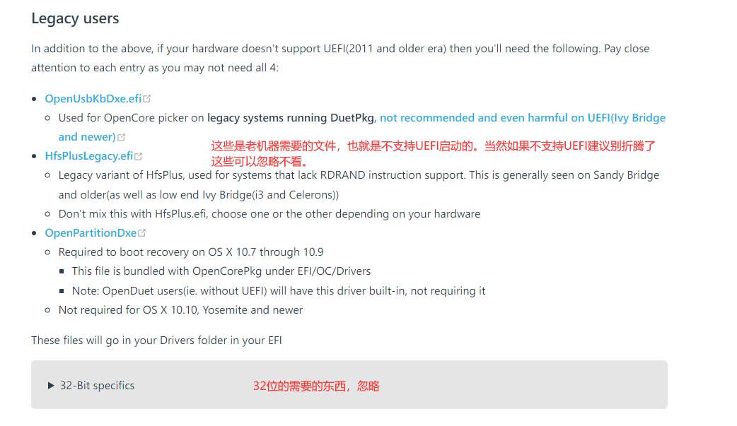 在EFI文件夹中打开各个目录,删除不需要的文件,保持文件最小化,这样出错会少点,其他一切等安装完黑苹果后再微调。以下为官方图,除了红框里的文件,其他全部删除。
