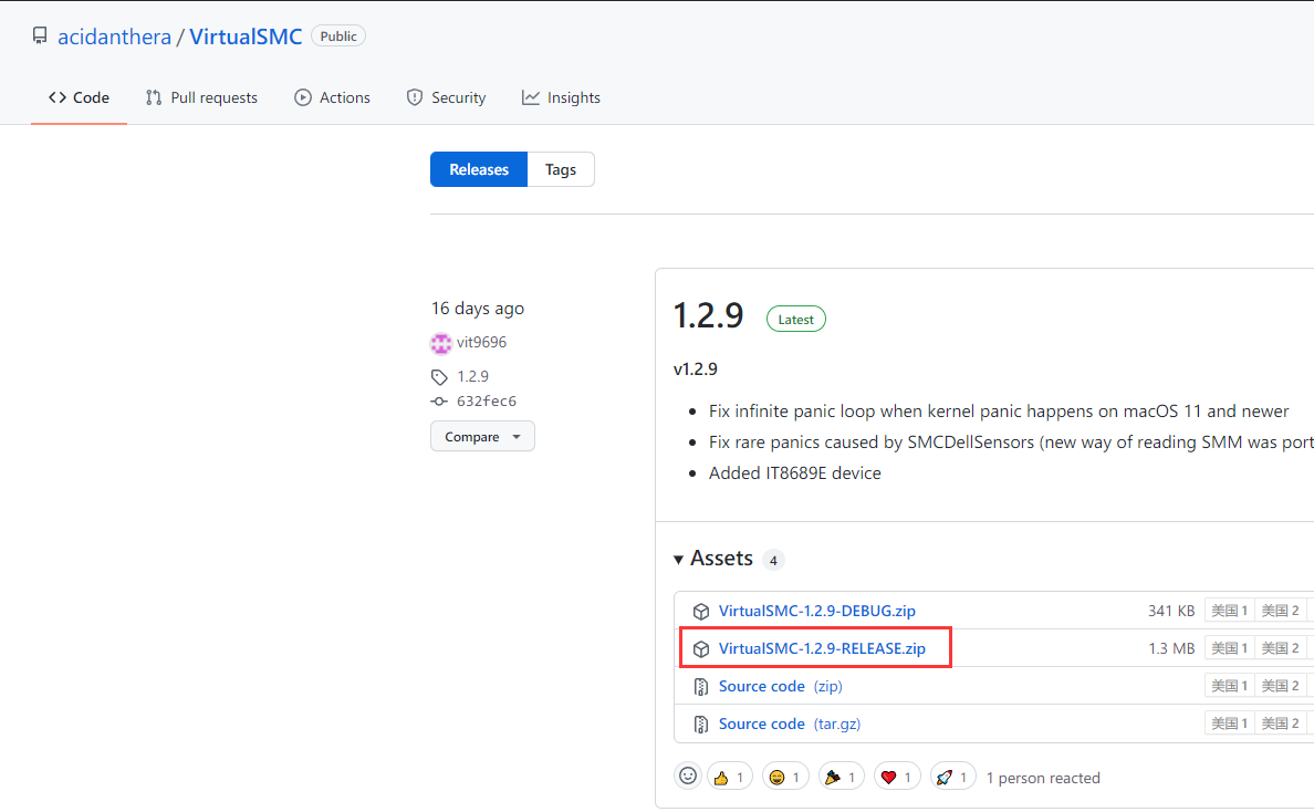 先下载第一个文件,VirtualSMC(这个是模拟Mac芯片,没有这个系统起不来)