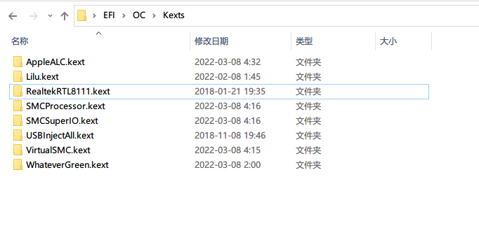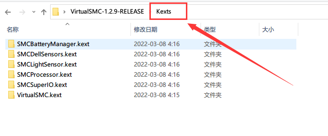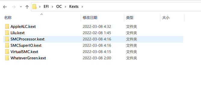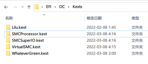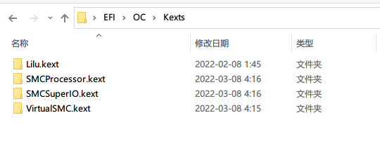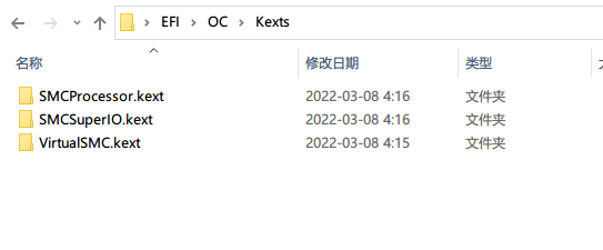 综合上面所说我们需要的文件是SMCProcessor.kext,SMCSuperIO.kext,其中VirtualSMC.kext是必须要的。所以我们把这3个文件复制到 EFIOCKexts目录