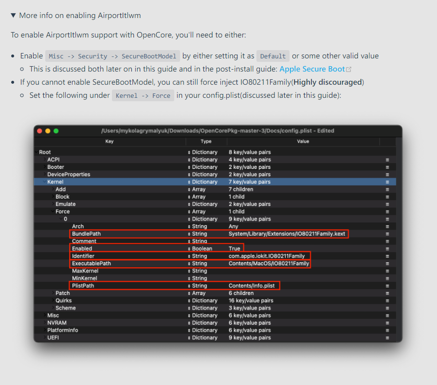 如果要OpenCore启用对AirportItlwm的支持则需要打开 Misc->Security->SecureBootModel,如果打开不了SecureBootModel选项,则需要设置红色框的内容 。