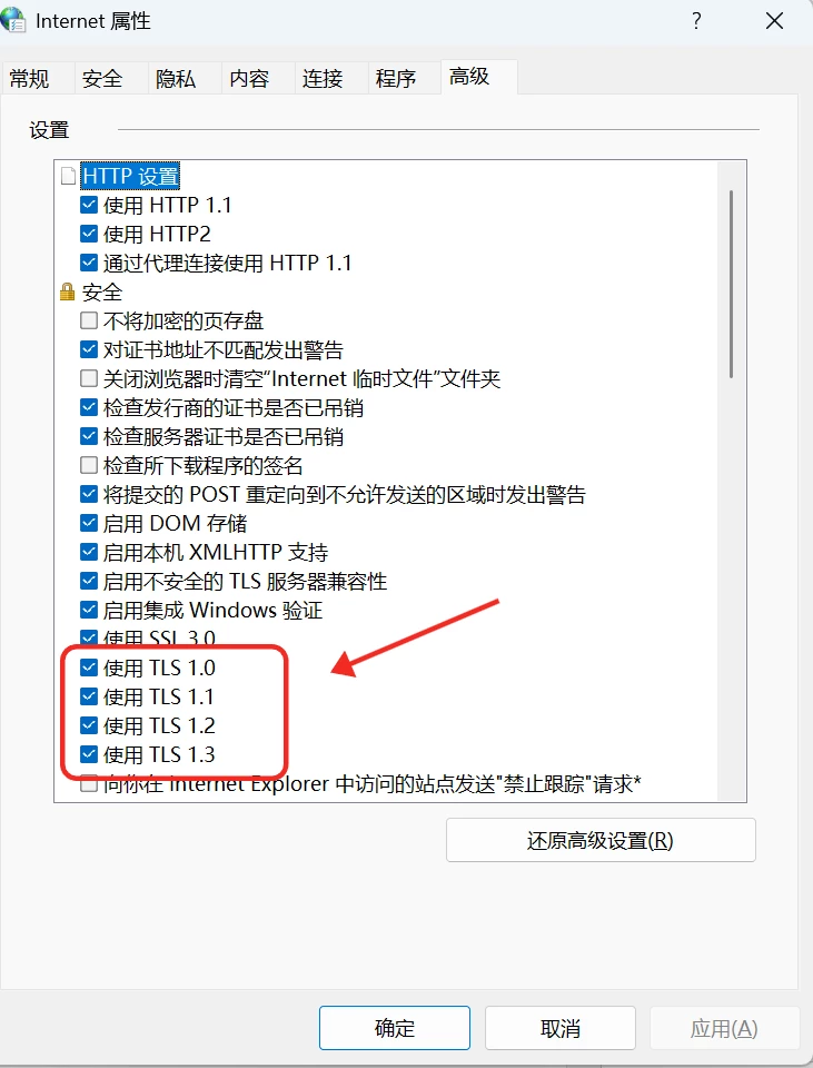 CMD输入inetcpl.cpl,在列表中勾选: