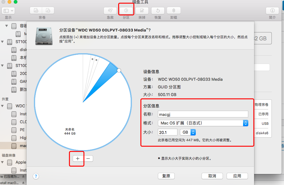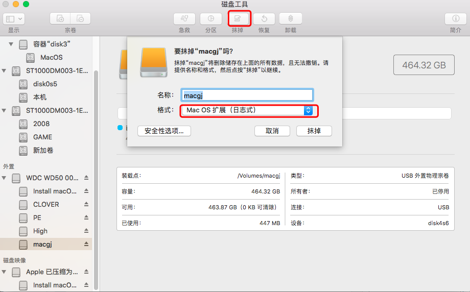 首先打开磁盘管理工具,把空闲空间抹掉为Mac OS扩展(日志式)