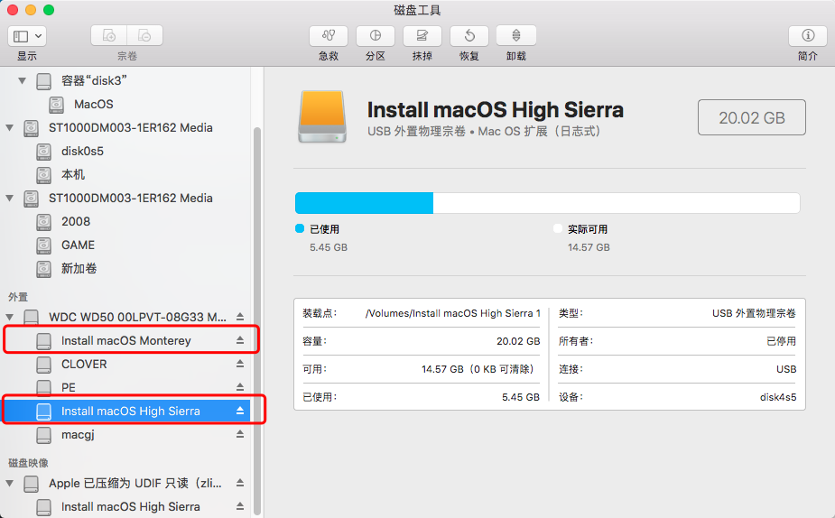 00G移动硬盘用来装一个系统太过于浪费,现在我们把它做成OpenCore,Clove,PE,3启动,安装镜像先弄成Monterey和High Sierra,再增加其他镜像同理。