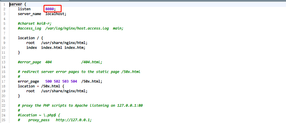 Nginx默认端口是80,但是WEB的端口也是80,为了不使他们冲突就需要更改Nginx的默认端口