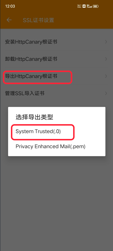 2、这里以演示打开HttpCanary_9.2.8.1小黄鸟为例,将系统证书导出,存储在真机路径【/storage/emulated/0/】下的HttpCanary目录中。