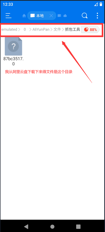 由于我是IQOO得手机,ES文件浏览器里面没有Documents目录,所以我的解决办法是真机里面打开文件管理器搜索87bc3517.0,然后上传到阿里云盘里然后在虚拟机里面下载下来