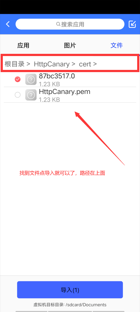 5、导入提取出来的小黄鸟系统根证书(87bc3517.0)到虚拟机中。