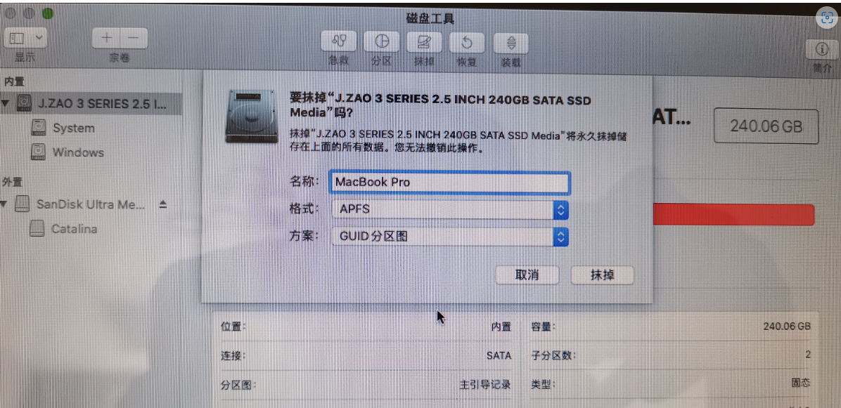 8、插入那个事先准备好的16G空白U盘(用系统自带的磁盘工具进行格式化,点“抹掉",格式选”MacOS扩展(日志型)”,然后点“抹掉”按钮)。我的U盘是Catalina,就选这个,点Start;