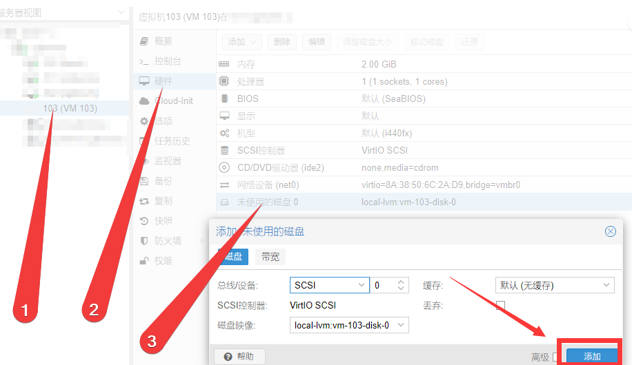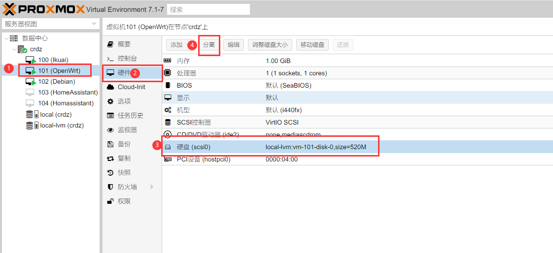 分离这个磁盘,因为用不着,我们是用刷写磁盘的方式安装openwrt,刷完会多一个磁盘,避免混淆引导项,所以准备分离并删除即可进入下一步操作