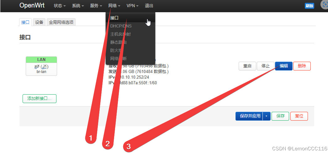 删掉多余无用接口,只留下Lan,因为旁路由只需要Lan,点编辑