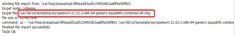qm importdisk 101 /var/lib/vz/template/iso/openwrt-21.02.3-x86-64-generic-squashfs-combined-efi.img local-lvm